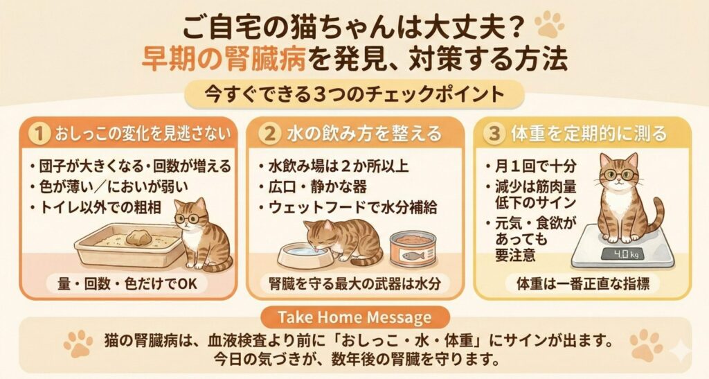 この時期からは、血液検査だけでなく、おしっこや水の変化を日常的に観察することがとても重要です。